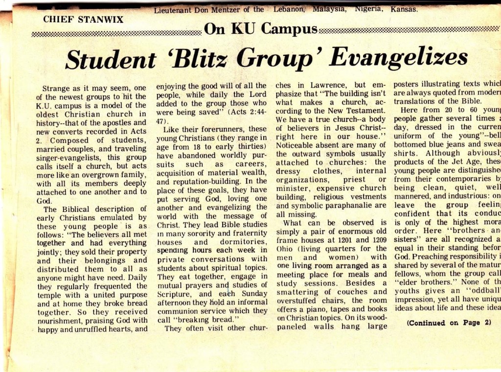 “Strange as it may seem, one of the newest groups to hit the K.U. campuses is a model of the oldest Christian church in history – that of the apostles and new converts recored in Acts 2. Composed of students, married couples, and traveling singer-evangelists, this group calls itself a church, but acts more like an overgrown family, with all its members deeply attached to one another and to God. . . They eat together, engage in mutual prayers and studies of Scripture, and each Sunday afternoon they hold an informal communion service which they call “breaking bread,” . . . [in] a living room arranged as a meeting place for meals and study sessions . . 20 to 60 young people gather several tims a day, dressed in the current uniform of the young – bell bottomed jeans and sweatshirts. Although obviously products of the Jet Age, these young people are distinguishable from their contemporaries by being clean, well-mannered and industrious.”